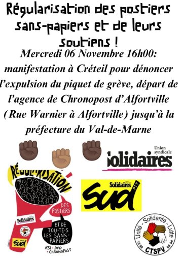 Après l’expulsion de leur piquet de grève jeudi 31 octobre, manifestons avec les travailleurs sans papiers de Chronopost Alfortville mercredi 6 novembre. Rendez-vous à 16 heures devant l’agence, rue Louis-Warnier, à Alfortville (RER D Le Vert-de-Maisons), pour marcher en direction de la préfecture du Val-de-Marne.