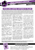 Depuis sa fondation en 2019, l’Union Communiste Libertaire est engagée contre la transphobie. Lors de son IIe congrès, en novembre 2023 à Angers, elle a précisé son analyse, son positionnement, et le sens de son soutien aux luttes trans. Disponible sur notre site internet et sur notre boutique en ligne.