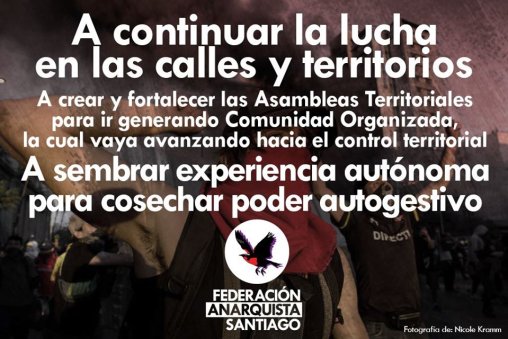 5- Enfin, nous réaffirmons la nécessité, de continuer la lutte dans les rues et dans les territoires. De créer et renforcer les Assemblées Territoriales afin de générer la Communauté Organisée, qui progressera vers le contrôle territorial. De semer l’expérience autonome afin de récolter le pouvoir autonome.