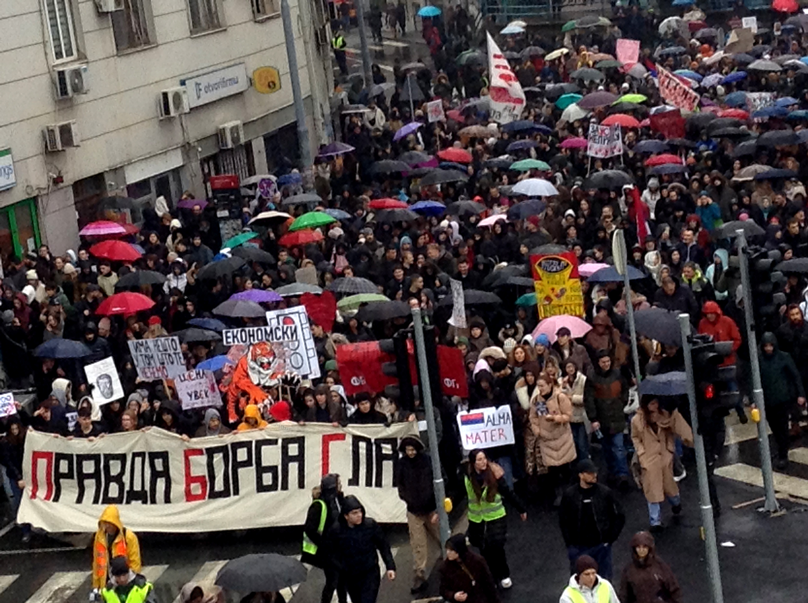Lors d’une manifestation massive, la police a utilisé un canon sonore émettant des bruits aigus pour provoquer une bousculade. Malgré tout, le mouvement reste fort. La « démocratie directe » horizontale employée par les étudiantes et étudiants s’est répandue parmi la classe ouvrière dans de nombreuses villes serbes. Comme l’a noté un anarchiste sous le pseudonyme de Random : « J’ai participé à une assemblée organisée pour plusieurs blocs [d’immeubles]. Les gens ont immédiatement accepté la démocratie directe. Presque toutes les personnes qui soutiennent cette manifestation voient également cette assemblée plénière, cette démocratie directe, cette façon de s’organiser, avec beaucoup d’admiration. Et cela représente un énorme potentiel pour le mouvement anarchiste. […] L’organisation anarchiste est l’une des principales raisons pour lesquelles ce mouvement connaît aujourd’hui un tel succès. »